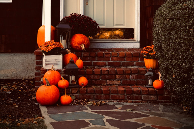 Welcome the fall season with a striking display on your front porch. Arrange mini haystacks, pumpkins, or gourds. Place a vintage container on a wooden box and fill it with a colorful fall plant. Swap out your front door mat for one crafted from natural materials, setting the tone for the season right at the entrance. Complete the look with a beautifully adorned fall wreath.